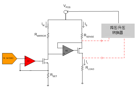 圖2:具有降壓/升壓轉(zhuǎn)換器的高端電壓—電流轉(zhuǎn)換器