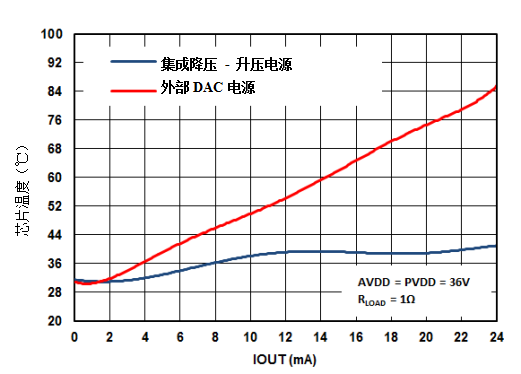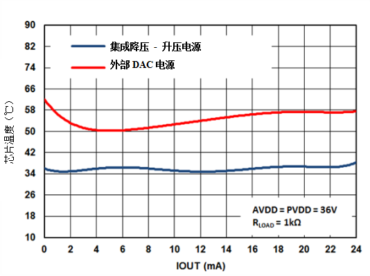 DAC8775的效率也導(dǎo)致需要更多的熱優(yōu)化系統(tǒng)。在具有和不具有自適應(yīng)功率反饋電路的四通道設(shè)計中比較芯片的結(jié)溫顯示了芯片溫度的顯著改善。圖3和圖4所示為DAC8775的測量結(jié)果,比較了在1Ω和1kΩ RLOAD情況下,使用和不使用降壓/升壓轉(zhuǎn)換器的模溫。從圖3可以看出,這種技術(shù)可以將結(jié)溫提高至高達(dá)36°C。