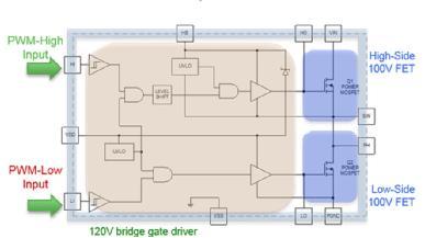FDMF8811集成了一對(duì)100V的功率MOSFET、120 V驅(qū)動(dòng)器IC和一個(gè)自舉二極管到6.0 mm x 7.5 mm 的PQFN封裝。