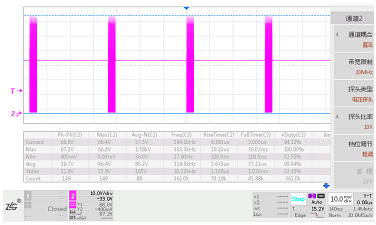 對(duì)于電源模塊的應(yīng)力設(shè)計(jì),重點(diǎn)關(guān)注場(chǎng)效應(yīng)管(MOS管)、二極管、變壓器、功率電感、電解電容、限流電阻等。保證全電壓范圍內(nèi)在穩(wěn)態(tài)、瞬態(tài)、短路等各種極限條件下都能有足夠的降額,以保障產(chǎn)品的可靠性。例如對(duì)于某Vds最高電壓為100V的MOS管,作為電源模塊的主功率開關(guān)管,實(shí)測(cè)其在最高輸入電壓下的各種狀態(tài)(如圖1~3所示),最高Vds=67.2V,降額因子0.672,滿足Ⅰ級(jí)降額,余量很充足。
